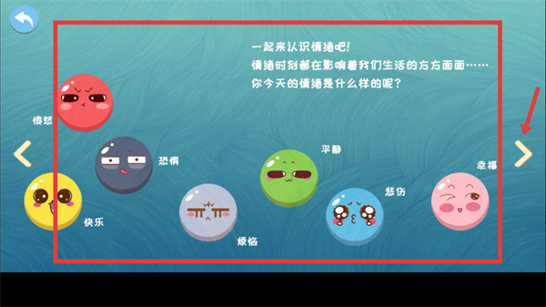 3、在“認(rèn)識(shí)情緒”頁(yè)面,可查看憤怒、快樂、恐懼等情緒的具象化圖標(biāo)展示,通過頁(yè)面兩側(cè)箭頭切換,了解更多情緒類型的特點(diǎn)。