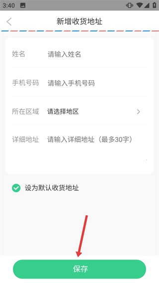 4、在【新增收貨地址】表單中填寫(xiě)姓名、手機(jī)號(hào)碼等信息后,點(diǎn)擊【保存】按鈕完成地址添加操作。
