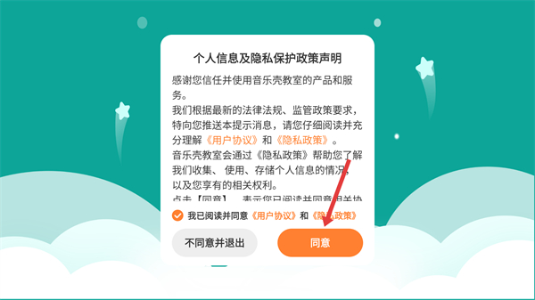 1、面對【個人信息及隱私保護政策聲明】彈窗,勾選“我已閱讀并同意”選項后,點擊【同意】按鈕,完成授權(quán)以進入音樂樂教室應用。