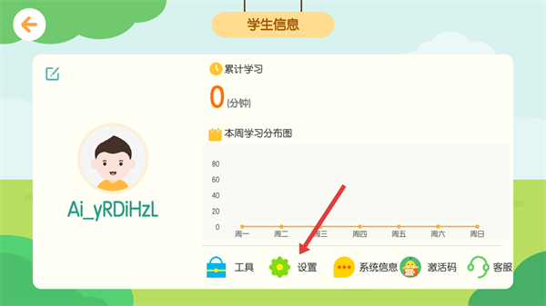 2、在應用主界面點擊左上角的頭像區(qū)域,進入【學生信息】頁面,可查看累計學習時長、本周學習分布圖等信息。