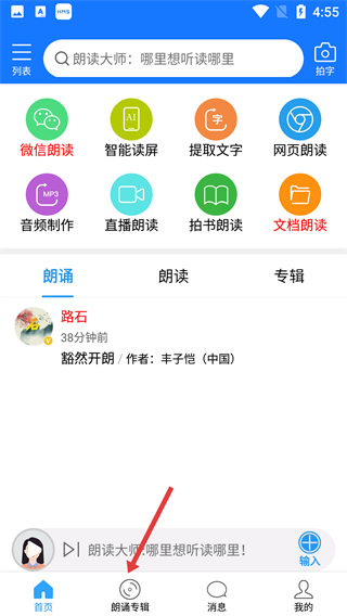 1、在應(yīng)用首頁點(diǎn)擊底部的【朗讀專輯】選項(xiàng),進(jìn)入朗讀專輯分類頁面,可瀏覽不同主題的朗讀內(nèi)容專輯。