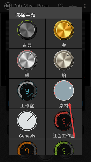 1、在【Dub-Dub-Music-Player】的選擇主題界面,點(diǎn)擊對(duì)應(yīng)主題選項(xiàng)(如【素材】),可自定義播放器的外觀風(fēng)格。