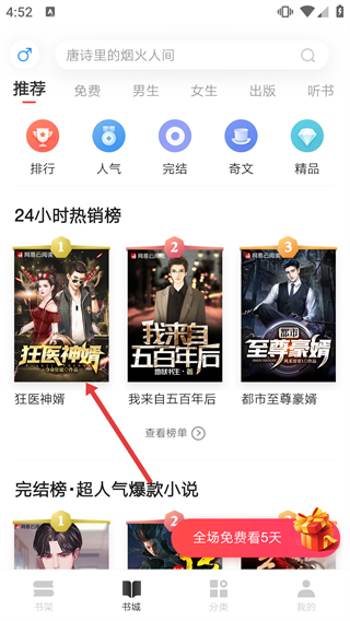 1、在閱讀APP的書(shū)城頁(yè)面,點(diǎn)擊24小時(shí)熱銷(xiāo)榜中的《狂醫(yī)神婿》條目,進(jìn)入該小說(shuō)的詳情頁(yè)面。