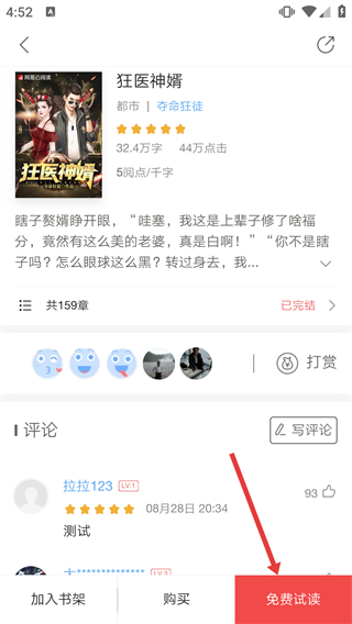 2、進(jìn)入小說(shuō)詳情頁(yè)后,點(diǎn)擊【免費(fèi)試讀】按鈕,進(jìn)入《狂醫(yī)神婿》的閱讀界面。