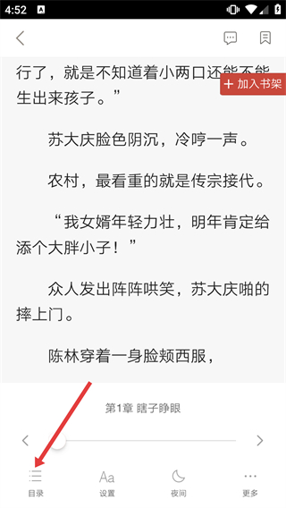 3、在閱讀界面中,點(diǎn)擊左下角的【目錄】按鈕,展開(kāi)該小說(shuō)的章節(jié)列表界面。