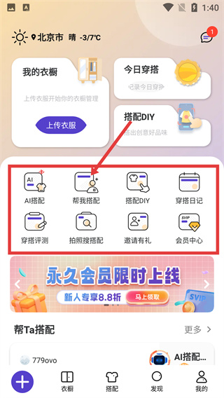 1、進(jìn)入應(yīng)用首頁(yè),有【幫我搭配】、【搭配DIY】等功能,點(diǎn)擊【幫我搭配】開(kāi)啟個(gè)人穿搭管理流程。