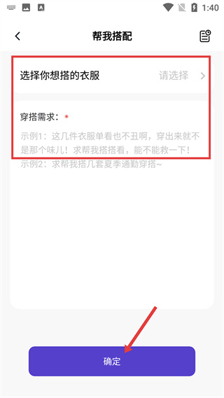 2、進(jìn)入【幫我搭配】頁(yè)面,先選擇【想搭的衣服】,再參照示例填寫(xiě)【穿搭需求】,完成后點(diǎn)擊【確定】獲取搭配方案。