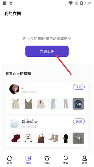 3、進(jìn)入【我的衣櫥】頁(yè)面,點(diǎn)擊【立即上傳】添加衣物,上傳后會(huì)自動(dòng)組搭配,還能參考【別人的衣櫥】汲取穿搭靈感。