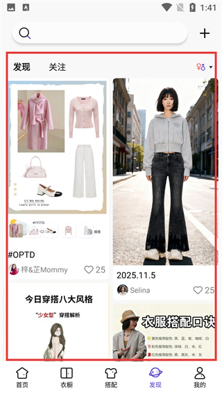 4、進(jìn)入【發(fā)現(xiàn)】頁(yè)面,切換【關(guān)注】、【發(fā)現(xiàn)】標(biāo)簽,查看穿搭分享、風(fēng)格解析等內(nèi)容,獲取多樣穿搭靈感。