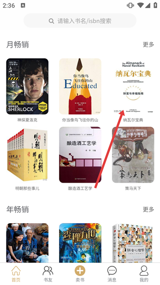 1、在應用首頁的“月暢銷”區(qū)域,選擇《納瓦爾寶典》書籍條目,進入該書的綜合詳情頁面,可查看書籍作者、出版社等基礎信息。