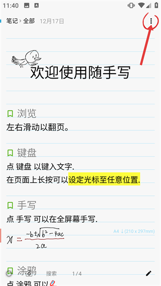 1、進(jìn)入【隨手寫(xiě)】頁(yè)面,點(diǎn)【手寫(xiě)】全屏手寫(xiě),右上角三點(diǎn)為功能入口。