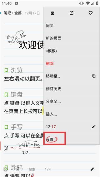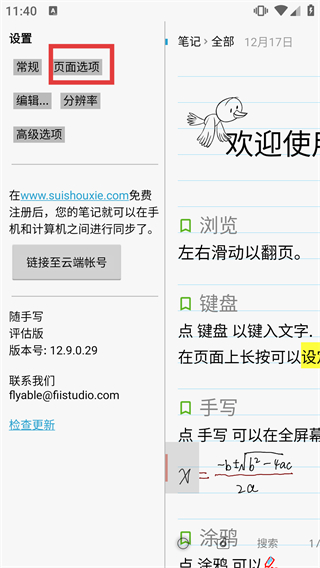 3、進(jìn)入【設(shè)置】頁(yè)面,選【頁(yè)面選項(xiàng)】可調(diào)整筆記參數(shù)。