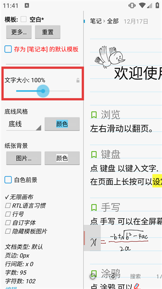 4、在【頁(yè)面選項(xiàng)】界面,可拖動(dòng)【文字大小】滑塊調(diào)整顯示比例,還能配置底線(xiàn)風(fēng)格-紙張背景等筆記顯示參數(shù)。