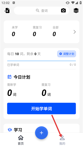 1、在單詞學(xué)習(xí)APP首頁(yè),可查看未學(xué)-需復(fù)習(xí)的單詞數(shù),點(diǎn)擊【開(kāi)始學(xué)單詞】啟動(dòng)學(xué)習(xí),底部【我的】是個(gè)人功能入口。
