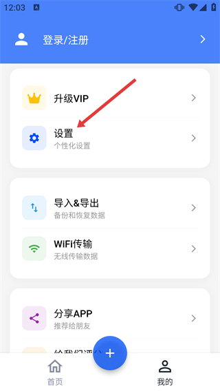 2、進(jìn)入【我的】頁(yè)面,可進(jìn)行【登錄/注冊(cè)】,找到【設(shè)置】選項(xiàng),能進(jìn)入個(gè)性化配置相關(guān)的功能界面。