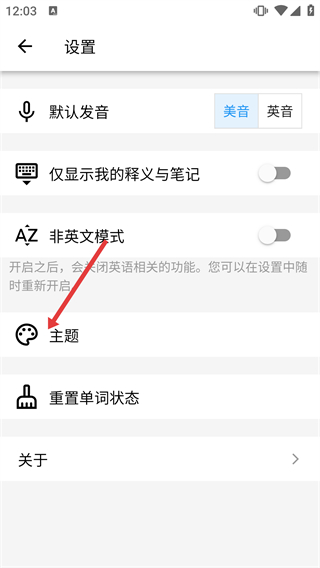 3、在【設(shè)置】頁(yè)面,可選擇【默認(rèn)發(fā)音】的美音-英音,點(diǎn)擊【主題】選項(xiàng),可進(jìn)入主題設(shè)置界面調(diào)整樣式。