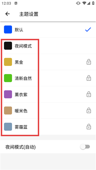 4、進(jìn)入【主題設(shè)置】頁(yè)面,可選擇【默認(rèn)】-【夜間模式】等主題樣式,部分主題需解鎖后才能使用。