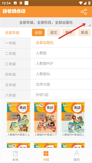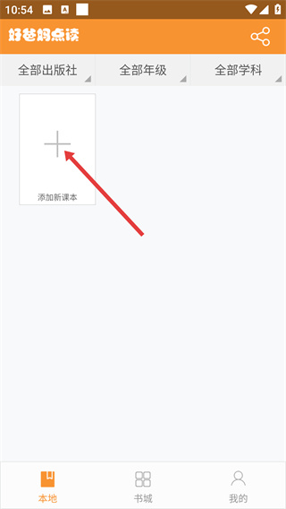 1、進(jìn)入APP【本地】頁(yè),點(diǎn)擊【添加新課本】按鈕,可通過(guò)【全部出版社】、【全部年級(jí)】等篩選條件查找對(duì)應(yīng)課本。