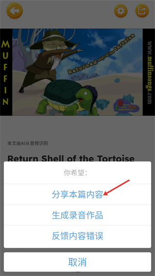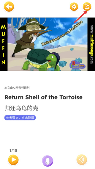 3、進入繪本閱讀頁,可查看故事標題及參考譯文,利用底部功能按鈕進行聽讀練習(xí),點擊右上角分享圖標展開操作選項。