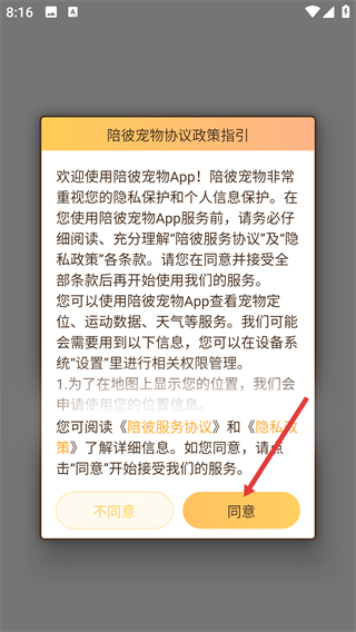 1、查看【陪彼寵物協(xié)議政策指引】,閱讀【陪彼服務(wù)協(xié)議】-【隱私政策】后,點(diǎn)擊【同意】按鈕以使用App的寵物定位等服務(wù)。