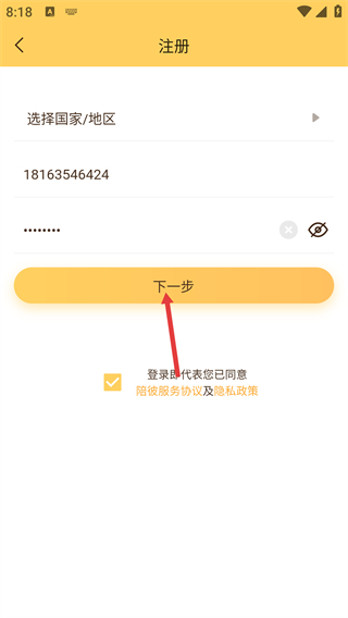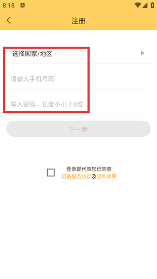 3、在注冊(cè)頁(yè)面,需填寫(xiě)【選擇國(guó)家/地區(qū)】-【請(qǐng)輸入手機(jī)號(hào)碼】-【輸入密碼-長(zhǎng)度不小于6位】,同時(shí)勾選相關(guān)協(xié)議。