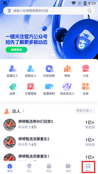 1、進入首頁后,可點擊【點擊關(guān)注】官方公眾號,查看【直播達人】等功能,再點底部【我的】進入對應(yīng)頁面。