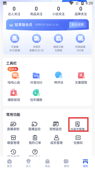 2、在【我的】頁面,查看【輕享版會員】信息,找到常用功能里的【抖音號管理】選項并點擊進入。