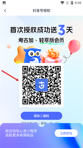 4、進入抖音號授權(quán)頁面,掃碼完成授權(quán),可享【首次授權(quán)成功送3天-考古加·輕享版會員】福利。