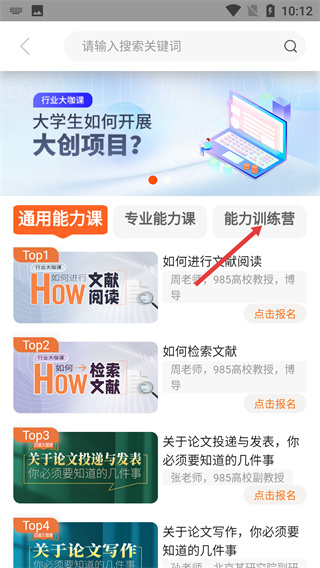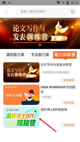 3、在能力訓練營的課程列表里,找到【海外博士DIY陪跑營】課程條目,點擊進入詳情頁。