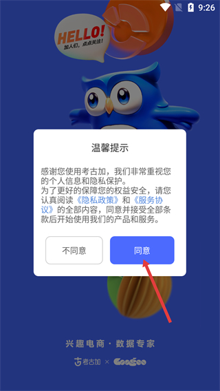 1、閱讀【隱私政策】-【服務協(xié)議】相關(guān)內(nèi)容,點擊【同意】按鈕,即可使用考古加的產(chǎn)品與服務。