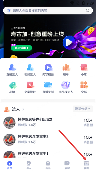2、進入首頁后,查看【直播達人】-【視頻達人】等功能入口,點擊底部【我的】進入對應頁面。
