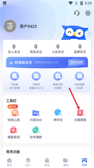 3、在【我的】頁面,找到工具欄中的【文案提取】選項,點擊該選項進入文案提取功能界面。