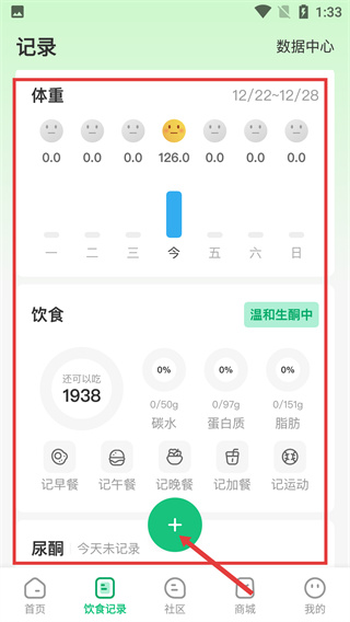 1、在記錄界面可查看【體重】數(shù)據(jù),【飲食】可攝入的熱量等,點(diǎn)擊綠色【+】即可添加記錄。