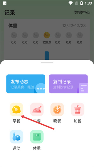 2、點(diǎn)擊【+】后會(huì)彈出選項(xiàng),含【發(fā)布動(dòng)態(tài)】、【復(fù)制記錄】,選擇【早餐】就能進(jìn)入對(duì)應(yīng)添加頁(yè)面。