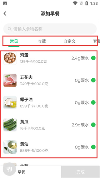 3、進(jìn)入添加早餐界面,有【常見】、【收藏】等分類,可選【雞蛋】等食物,同時(shí)顯示其熱量、碳水信息。