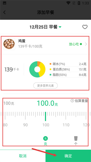 4、選定【雞蛋】后可調(diào)整重量,查看【碳水】、【蛋白質(zhì)】等營(yíng)養(yǎng)占比,點(diǎn)擊【確定】即可完成添加。
