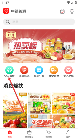 1、在中銀善源的首頁(yè),點(diǎn)擊“定點(diǎn)幫扶”選項(xiàng),進(jìn)入幫扶縣及對(duì)應(yīng)商品分類的頁(yè)面。