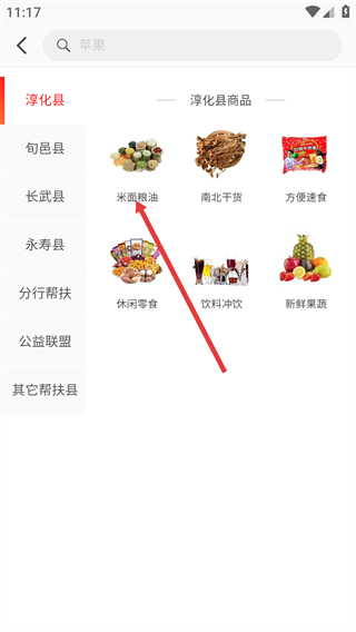 2、進(jìn)入定點(diǎn)幫扶頁(yè)面后,選擇目標(biāo)幫扶縣下的商品分類,進(jìn)入該分類的商品列表頁(yè)面。