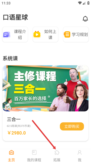 1、在口語星球的首頁,點擊底部導(dǎo)航欄的“拓展”選項,進(jìn)入拓展功能頁面。