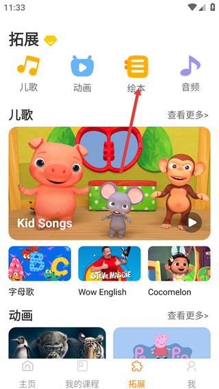 2、進(jìn)入拓展頁面后,點擊“繪本”選項,進(jìn)入繪本館的資源列表頁面。