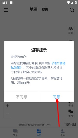 1、應(yīng)用彈出【溫馨提示】,提示閱讀【地圖慧隱私政策】,點擊【同意】按鈕即可進入地圖主界面。