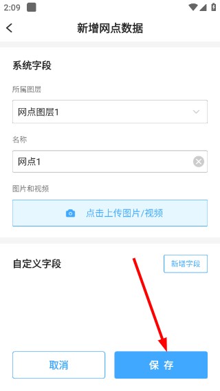 4、在【新增網(wǎng)點數(shù)據(jù)】頁面,確認(rèn)所屬圖層、名稱等信息后,點擊【保存】按鈕完成網(wǎng)點數(shù)據(jù)的新增操作。