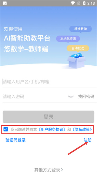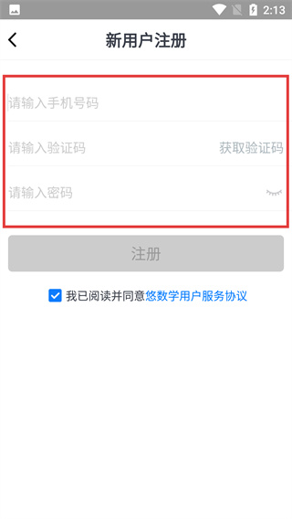 1、在APP登錄界面,勾選【用戶服務(wù)協(xié)議】和【隱私政策】后,點(diǎn)擊【注冊(cè)】按鈕,進(jìn)入新用戶注冊(cè)的信息填寫頁面。