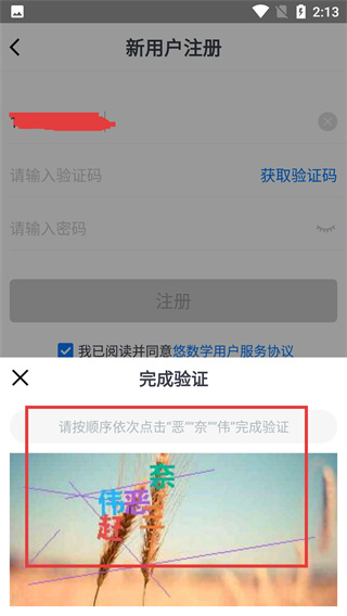 3、觸發(fā)驗(yàn)證后,在【完成驗(yàn)證】彈窗內(nèi),按“惡”“奈”“偉”的順序點(diǎn)擊對(duì)應(yīng)文字,完成驗(yàn)證以獲取注冊(cè)所需的驗(yàn)證碼。