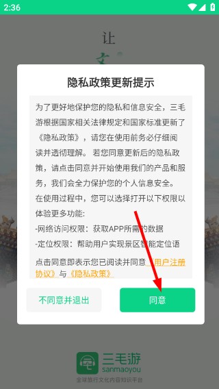 1、應(yīng)用彈出【隱私政策更新提示】,閱讀【用戶注冊協(xié)議】與【隱私政策】后,點(diǎn)擊【同意】按鈕即可進(jìn)入應(yīng)用。
