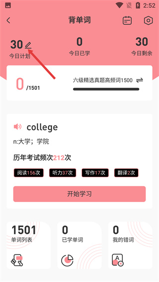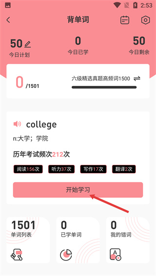 4、單詞學(xué)習(xí)計(jì)劃確認(rèn)后,點(diǎn)擊頁面中的【開始學(xué)習(xí)】按鈕,進(jìn)入六級(jí)高頻單詞的具體學(xué)習(xí)流程。