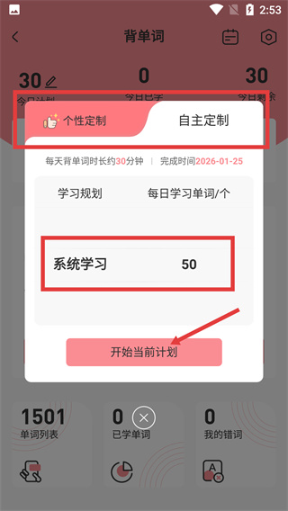 3、在學(xué)習(xí)計(jì)劃配置彈窗中,選定【系統(tǒng)學(xué)習(xí)-50】的當(dāng)日單詞量,點(diǎn)擊【開始當(dāng)前計(jì)劃】按鈕確認(rèn)學(xué)習(xí)計(jì)劃。