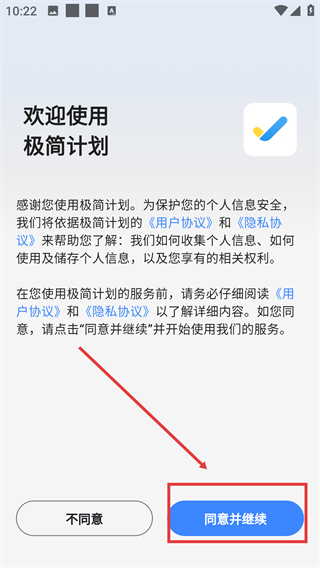 1、首次使用【極簡計(jì)劃】,需閱讀《用戶協(xié)議》《隱私協(xié)議》了解信息規(guī)則,點(diǎn)擊【同意并繼續(xù)】按鈕,即可進(jìn)入軟件的任務(wù)管理界面。