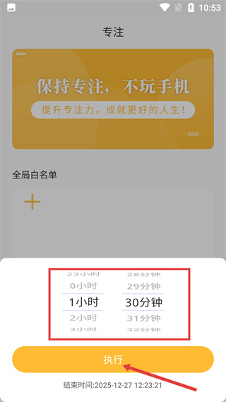 2、在時(shí)長(zhǎng)選擇界面選定目標(biāo)專注時(shí)長(zhǎng),點(diǎn)擊“執(zhí)行”按鈕,啟動(dòng)專注計(jì)時(shí)流程。