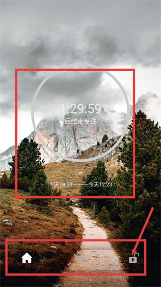 3、進(jìn)入專注計(jì)時(shí)頁(yè)面,可查看專注倒計(jì)時(shí)、時(shí)段信息,同時(shí)頁(yè)面底部呈現(xiàn)鎖定按鈕,保持專注狀態(tài)。